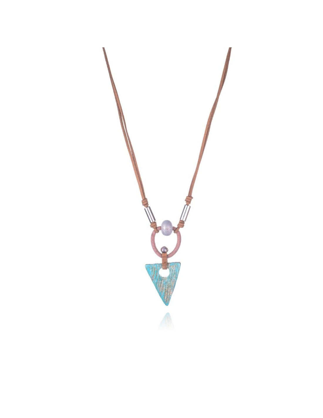 Collar ajustable de 70 cm de largo en su extensión máxima con un adorno de madera de 5,5 cm de forma triangular y de color azul turquesa con reflejos dorados. Adornos metálicos rematan esta espectacular pieza. Su longitud media define la percepción de su figura.