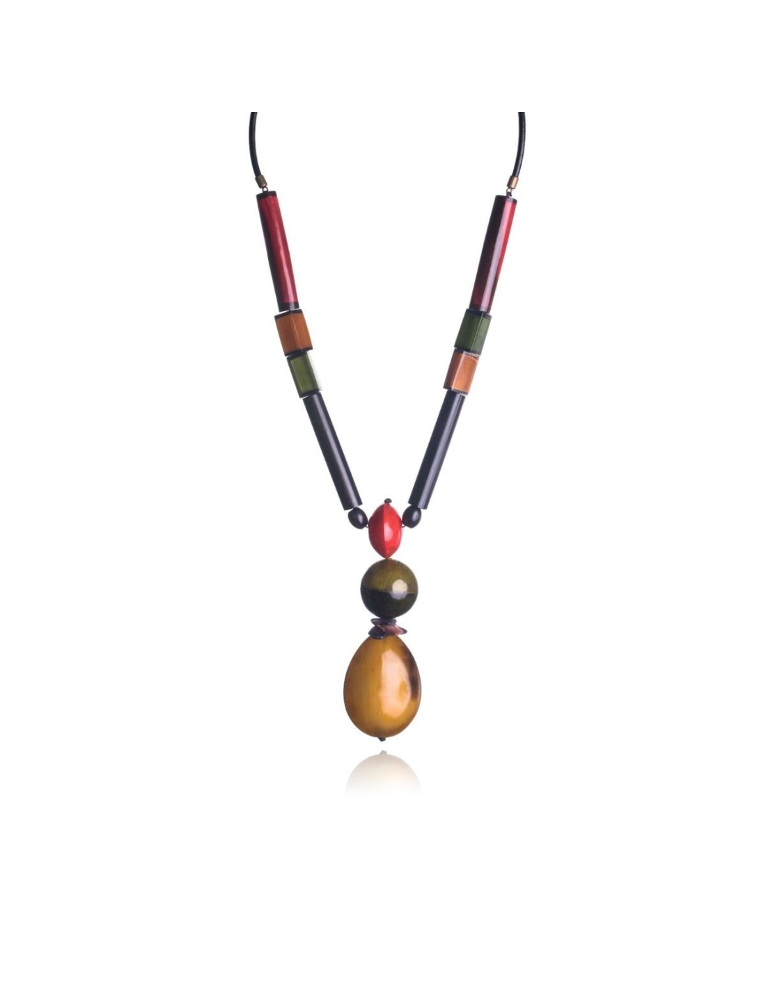 Un collar con luz propia. Una de nuestras piezas más especiales. Collar de 110 cm de largo con cordón de cuero negro en el cuello y del que prenden piezas de asta lacada en diferentes formas a ambos lados, rematado por pieza esférica y medallón en forma de lágrima de 8 cm.