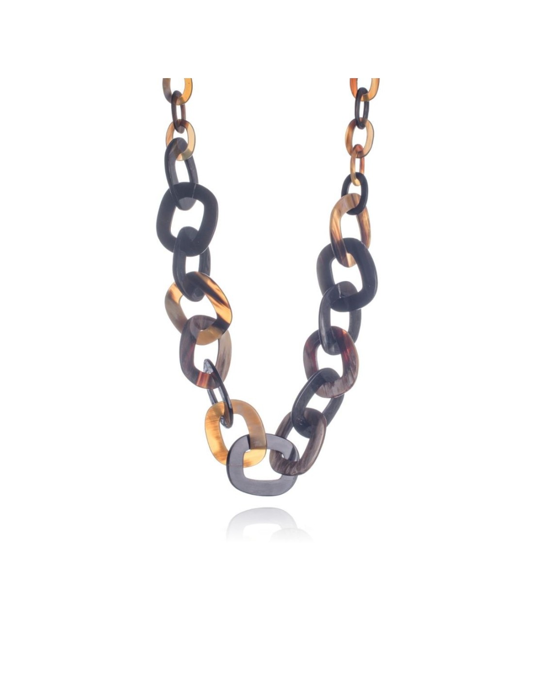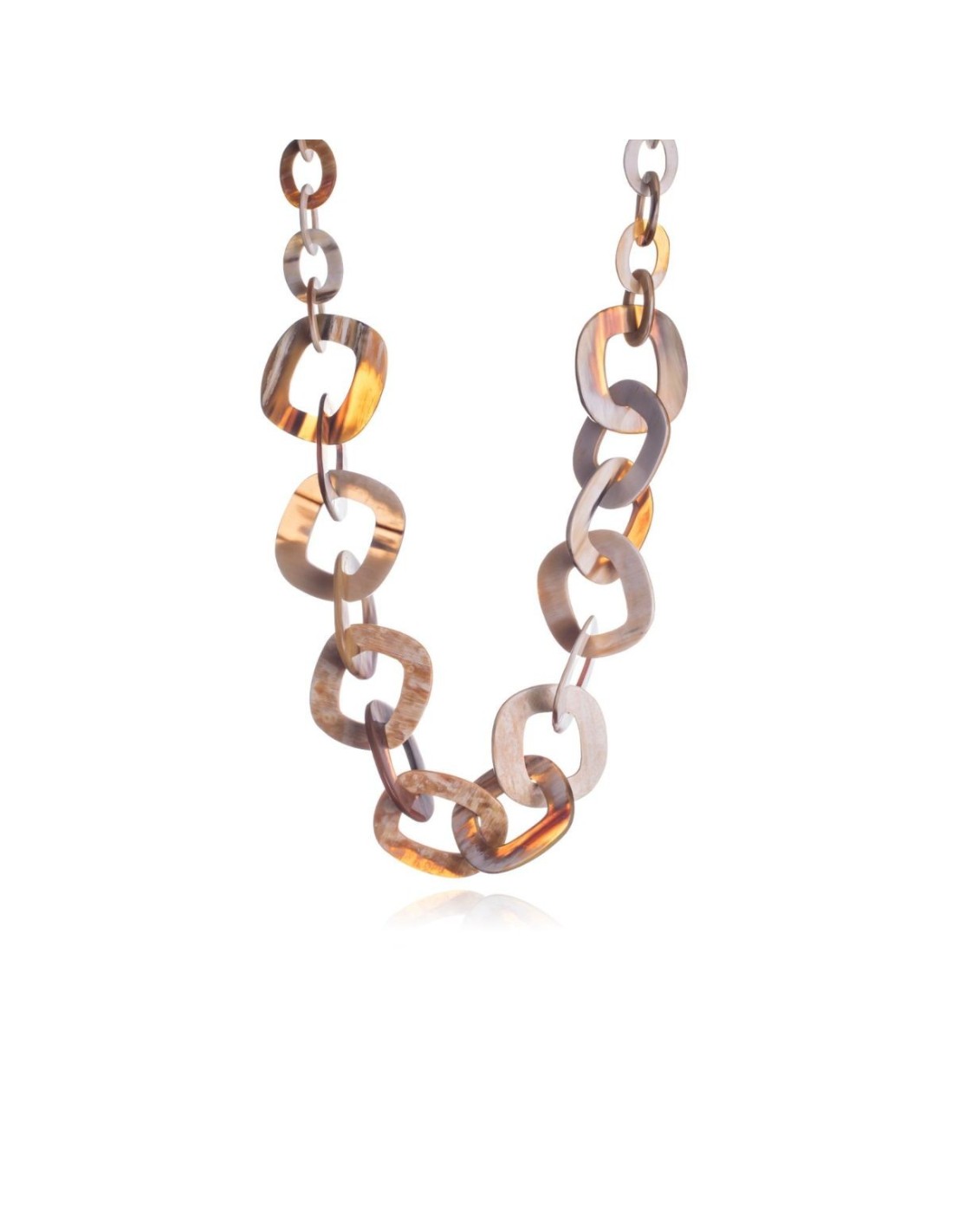 Un collar espectacular, práctico y distinguido para que la acompañe siempre. Collar largo en forma de cadena con eslabones de asta de dos tamaños. Su longitud de 100 cm lo convierten en el accesorio perfecto. Ligero e ideal para definir la figura.